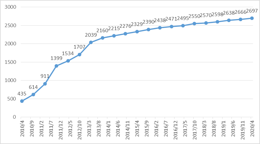 據全球IPv6論壇IPv6 Enabled WWW Logo認證項目統計,截止到2020年6月,全球已有2697個網站通過IPv6 Enabled WWW Logo測試并獲得認證。以下是IPv6 Enabled WWW Logo項目提供的累年總體統計數據,如圖9。IPv6 Enabled認證的網站按國家/地區分布統計如圖10,IPv6 Enabled Logo按網站類型統計如圖11。