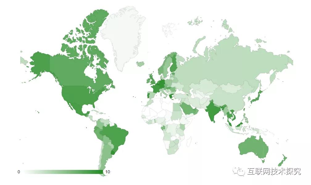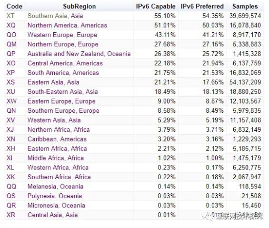 表2展示了各大洲的IPv6支持能力。亞洲地區,南亞地區IPv6支持能力最高,整體水平達到了55%,東亞以及東南亞也達到了21%和19%,西亞僅有5%,中亞幾乎為0。美洲地區方面,北美地區也達到了51%,中美和南美也分別達到了22%和21%,加勒比地區僅有3%。歐洲方面,西歐地區IPv6支持能力較高達到了43%,北歐有27%,東歐和南歐僅有9%和8.5%。非洲地區IPv6支持度較差,沒有一個地區超過5%。