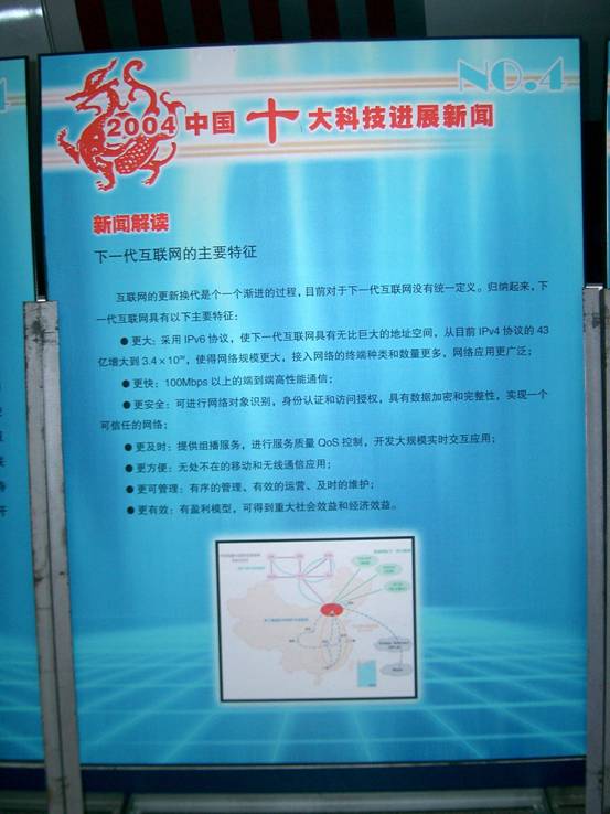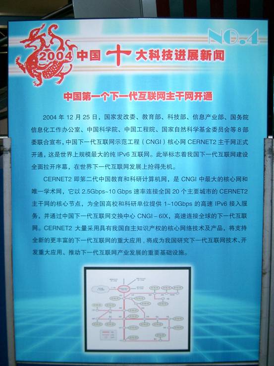 日前,“2004年中國、世界十大科技進(jìn)展新聞”科普展覽在北京中國科技館開幕。展覽由科學(xué)報時社、中國科學(xué)院院士工作局、中國工程院學(xué)部工作局和中國科學(xué)技術(shù)館聯(lián)合舉辦,將在全國各地科技館巡回展出。此次展覽的主要內(nèi)容是“振邦杯2004年中國十大科技進(jìn)展新聞和世界十大科技進(jìn)展新聞”,由584名中國科學(xué)院院士和中國工程院院士投票選出。作為2004年科技發(fā)展重大事件之一,以中國下一代互聯(lián)網(wǎng)示范工程CNGI核心網(wǎng)CERNET2也參加了此次全國巡展,并將以圖文并茂、專家點評、新聞鏈接等形式,全方位、立體化展現(xiàn)給社會公眾。