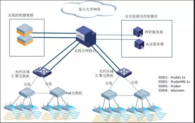 該項目的實施,不僅提高了復(fù)旦大學(xué)無線網(wǎng)絡(luò)覆蓋率,也使學(xué)校信息化基礎(chǔ)建設(shè)邁向新的臺階:一是實現(xiàn)了復(fù)旦大學(xué)四個校區(qū)無線網(wǎng)絡(luò)架構(gòu)的統(tǒng)一,每校區(qū)分別部署2臺集群式核心,通過OSPF實現(xiàn)校區(qū)間三層互聯(lián),無線網(wǎng)絡(luò)采用網(wǎng)關(guān)部署在核心的二層組網(wǎng)模式,易于維護管理;二是AC旁掛核心,采用隧道模式轉(zhuǎn)發(fā),實現(xiàn)無線終端流量的統(tǒng)一監(jiān)控管理;三是接入-匯聚-核心在非上聯(lián)端口均開啟端口隔離功能,減小廣播域的同時,提高了網(wǎng)絡(luò)的健壯性。