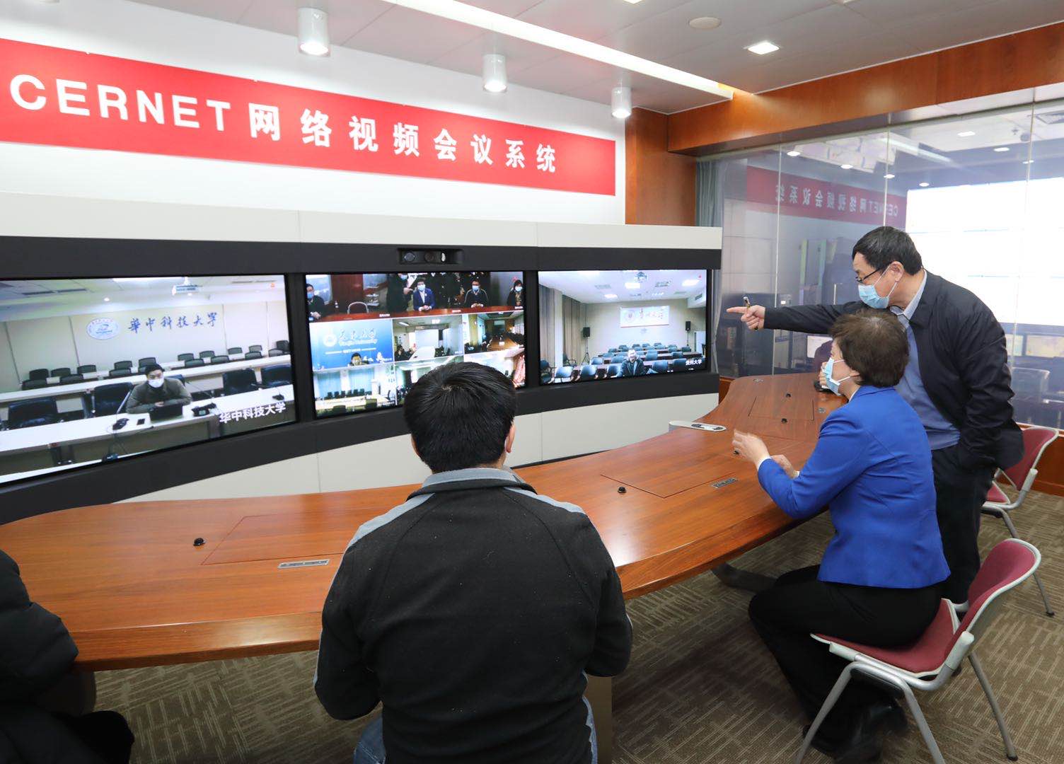 陳旭在指揮中心與華中科技大學CERNET核心節(jié)點運行值班人員視頻連線,向身在武漢共同運維CERNET主干網(wǎng)的老師們表示問候,“清華牽掛著你們,在我們共同保障網(wǎng)絡(luò)安全服務(wù)同時,也要保護好自己!”