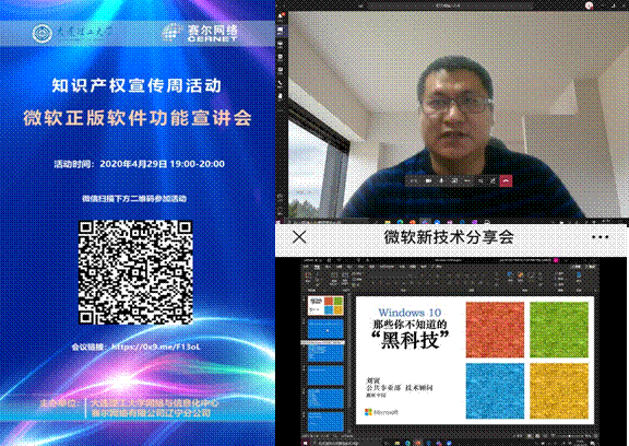 2020年4月29日,大連理工大學(xué)網(wǎng)信中心與賽爾網(wǎng)絡(luò)有限公司遼寧分公司在線上合作舉辦了主題為“微軟正版軟件功能宣講會”的活動。此次活動旨在宣傳知識產(chǎn)權(quán)保護,提高學(xué)校的綜合信息化水平,同時為師生分享正版軟件的實用性技術(shù),營造正版軟件的使用氛圍。