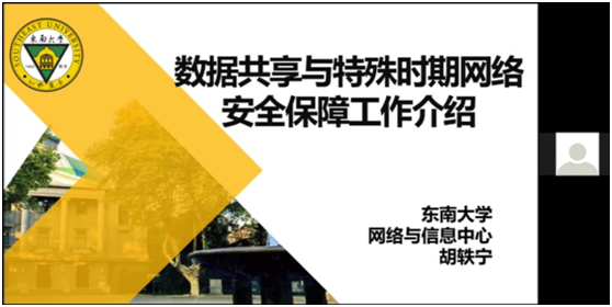 在安全領域有著豐富經驗的東南大學網絡與信息中心副主任胡軼寧,分享了東南大學通過數據共享推動核心業務數據處理方面的探索,以及疫情期間網絡保障、信息化支撐及信息安全保障方面的經驗。