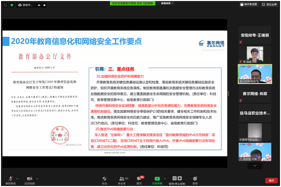 在為期兩個小時的交流會議中,百余名老師積極參與,并就招生網站安全、安全域名證書、個人信息防護等技術問題進行了詳細的交流。老師們對賽爾網絡河南分公司提供的此次線上技術交流活動給予了充分肯定和一致好評。
