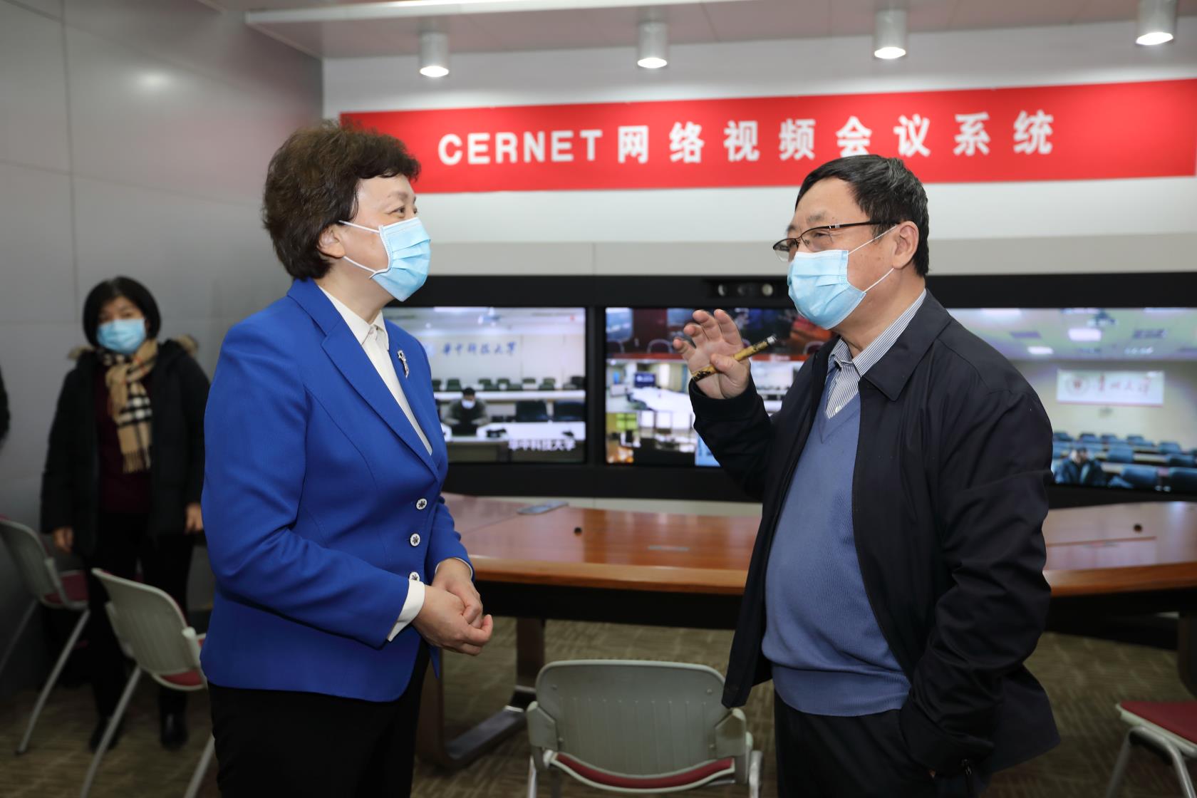 在2月17日我國首批高校正式開課的第一天上午,也是CERNET網絡保障進入戰時管理運行的第一天,清華大學黨委書記陳旭一行來到CERNET網絡中心調研疫情防控工作。在中國教育和科研計算機網CERNET疫情防控網絡保障指